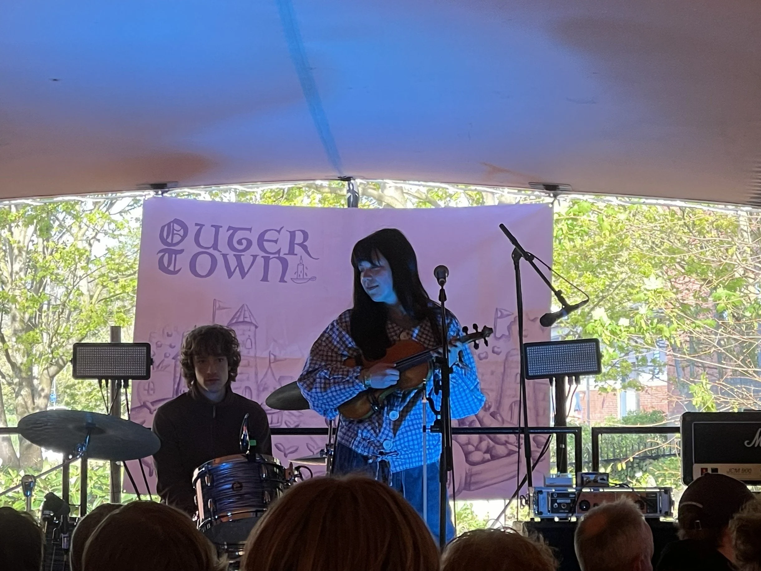Ninush was next, back outside the Trinity Centre with her now signature blend of classical and whimsical pop. Her first experiences playing violin outside of a classic context was filling in for Georgia Ellery on Black Country, New Road’s 2022 tour, she’s been developing her own he released her five song EP, The Flowers I see in You, in February. With drums and guitar either side, Ninush took centre stage, playing violin and singing. Expertly plucking the strings into crescendoing staccato melodies, her ethereal voice seeming to float atop, she left the audience entranced. After that, we switched up the vibe next with Moreish Idols, who delivered a bit of a rockier sound, made interesting by jazzy saxophone and flute melodies. After grabbing a slice at Gigi’s Pizza (the perfect mid-festival snack), we were back to the Exchange.